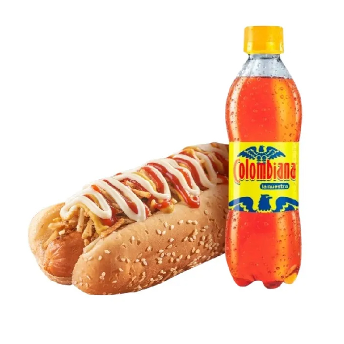 Salchicha americana, 2 toppings, 2 salsas, 1 gaseosa postobon 250 ml