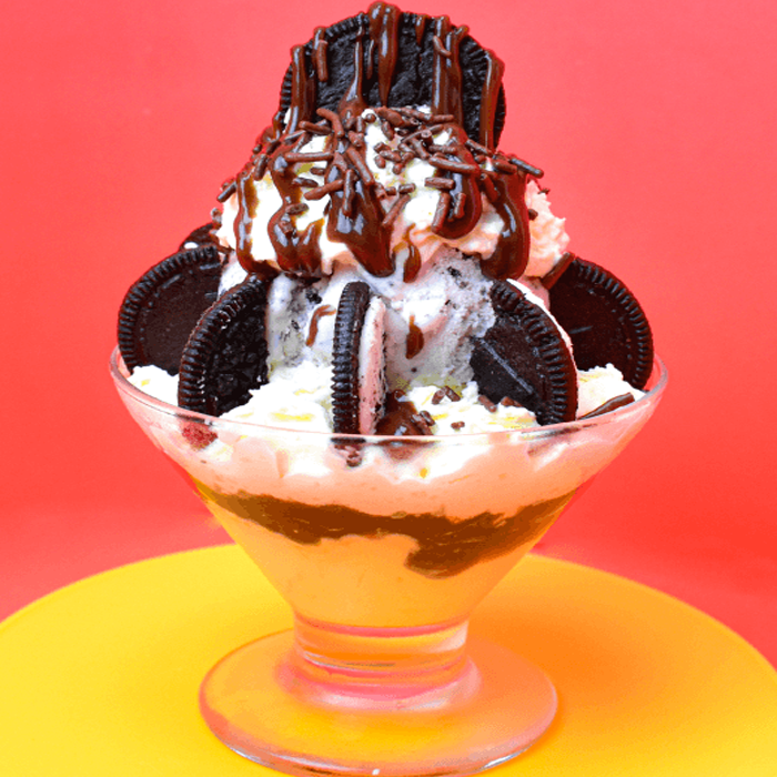 Una porción de helado, chantilly, trozos de galleta oreo, salsa de chocolate